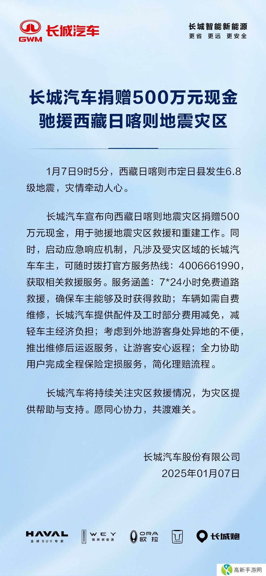 本站 1 月 7 日消息,长城汽车今晚宣布,紧急捐赠 500 万元现金,驰援西藏日喀则地震灾区。并为灾区车主提供 7×24 小时免费道路救援、维修费用减免等多项关怀服务。凡涉及受灾区域的长城汽车车主,