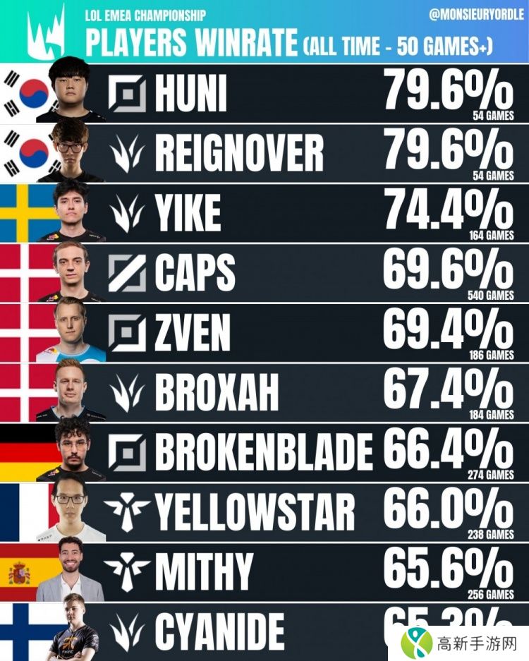 直播吧1月6日讯 LEC历史上胜率最高的选手排名公布,Huni和Reignover两位韩援以79 6%的胜率并列第一。