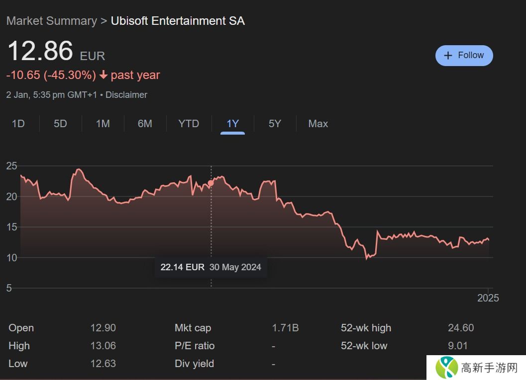 本站 1 月 5 日消息,法国知名游戏公司育碧(Ubisoft)正陷入严重的财务危机。自 2024 年初以来,该公司股价已暴跌超过 45%,创下一年来的历史新低。这引发了市场对其未来发展的广泛担忧,甚