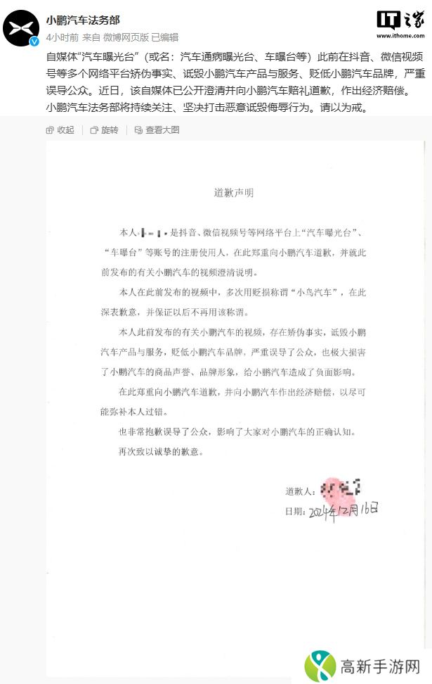 本站 1 月 4 日消息,小鹏汽车法务部今日发文称,自媒体“汽车曝光台”(或名:汽车通病曝光台、车曝台等)此前在抖音、微信视频号等多个网络平台矫伪事实、诋毁小鹏汽车产品与服务、贬低小鹏汽车品牌,严重误