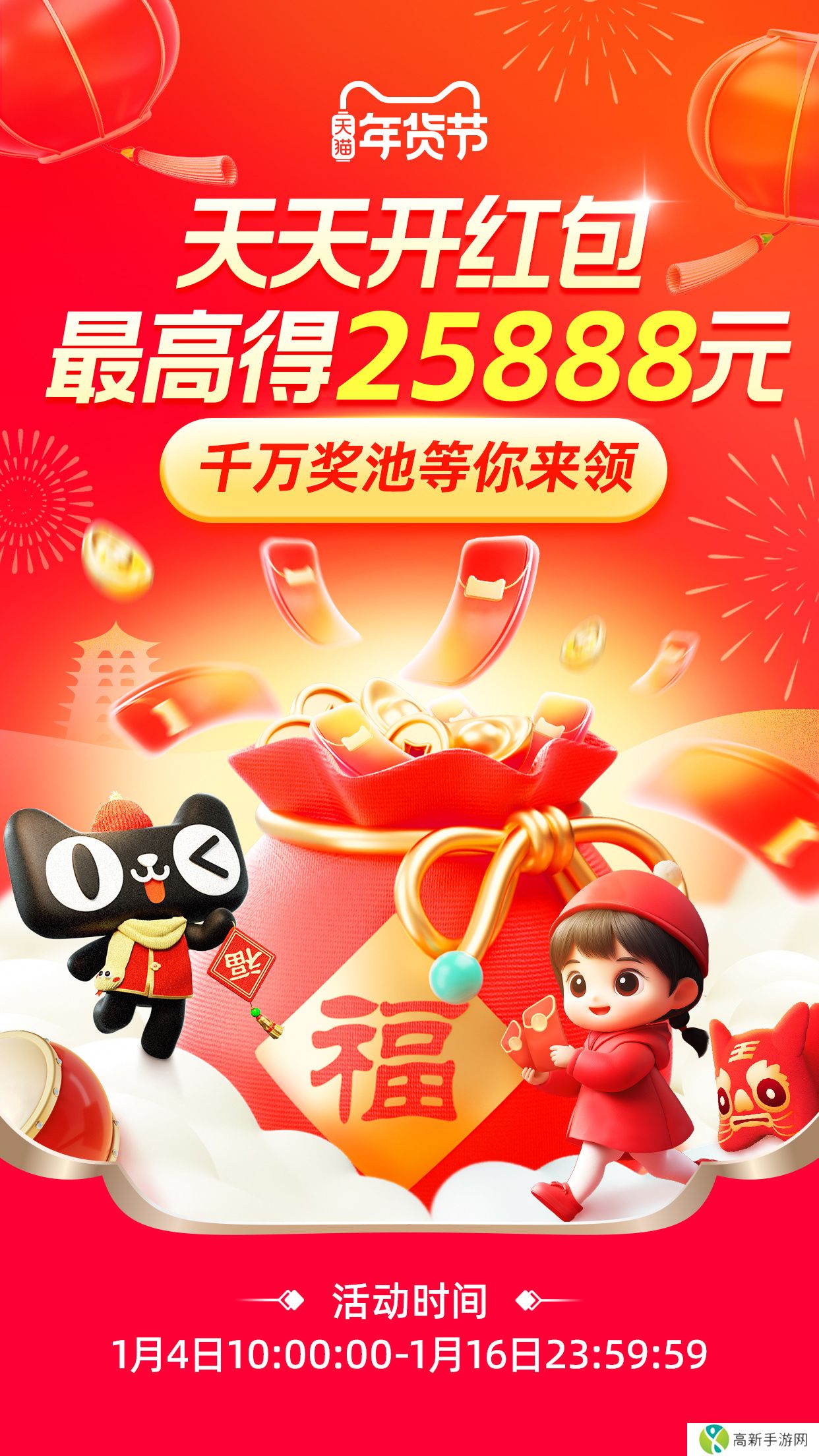 天猫 2025 年货节现金红包 1 月 4 日 10:00 正式开抢,面额至高 25888 元:点此抽红包。京东年货节无门槛红包也在发放中,每天可抽 3 次,面额至高 9999 元:点此抽红包。淘宝