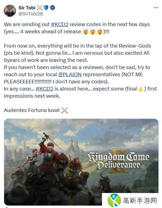 根据战马工作室全球公关经理Tobias Stolz-Zwilling透露,《天国:拯救2》的媒体评测代码即将在未来几天内发送,具体时间是游戏发售前“提前四周”,并且在下周游戏(