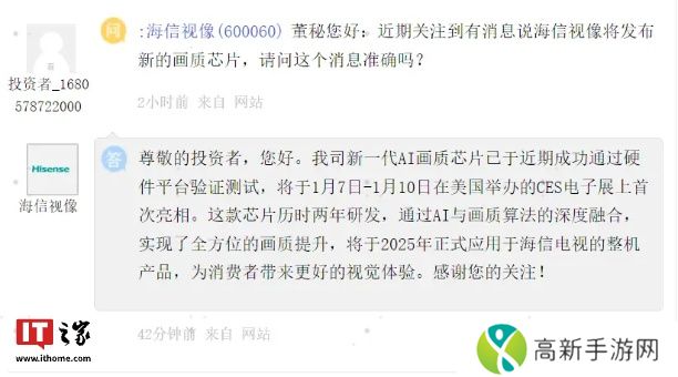 本站 1 月 3 日消息,1 月 3 日,海信视像在上证 E 互动平台回答投资者提问时透露,海信新一代 AI 画质芯片已于近期成功通过硬件平台验证测试,将于 1 月 7 日-1 月 10 日在美国举办