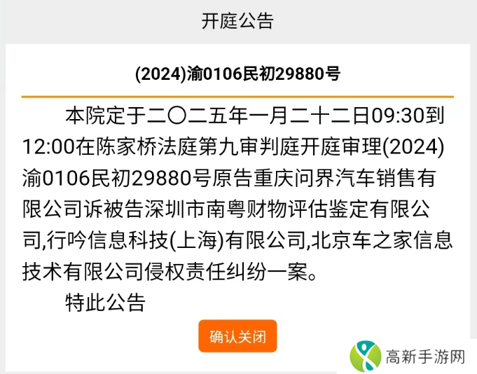感谢本站网友 西窗旧事 的线索投递! 本站 1 月 3 日消息,重庆法院公众服务网今日显示,重庆问界汽车销售有限公司与深圳市南粤财物评估鉴定有限公司、行吟