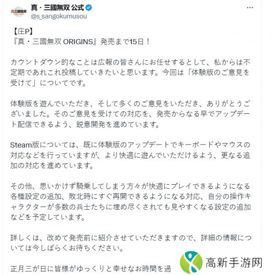 《真三国无双:起源》即将于2025年1月17日发售,目前距离发售还有15天时间。今天官推@真?三國無双 公式发布了一个新的推文,主要聊了聊体验版的一些反馈。官方确认《真三国无双:起源》PC Steam