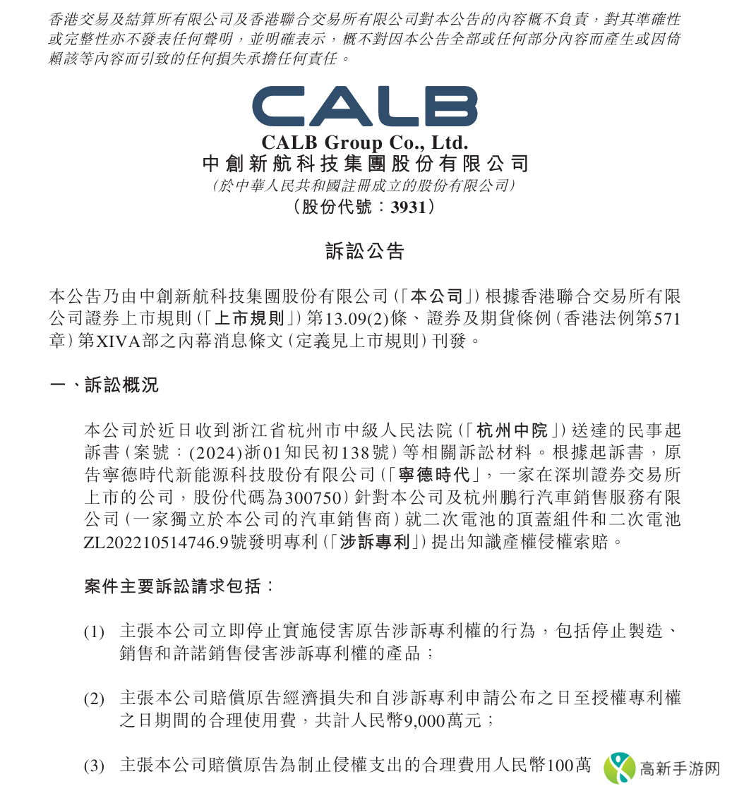 感谢本站网友 西窗旧事 的线索投递! 本站 1 月 3 日消息,中创新航公告称,宁德时代向杭州市中级人民法院提起诉讼,就二次电池的顶盖组件和相关发明专利向