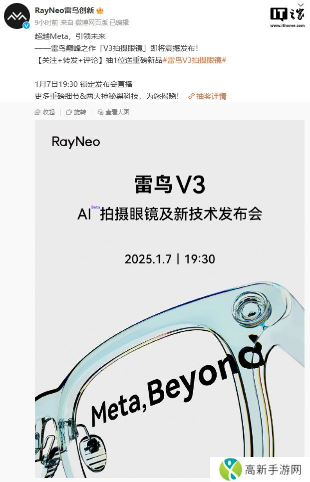 本站 1 月 2 日消息,RayNeo 雷鸟创新今日宣布,雷鸟 V3 AI 拍摄眼镜及新技术发布会定档 1 月 7 日 19:30,号称“超越 Meta,引领未来”。从产品名称不难看出,新品将主打 A