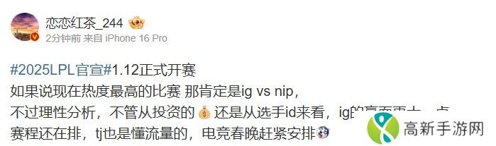 直播吧1月2日讯 2025LPL赛事将于1月12日开赛,微博爆料人恋恋红茶发文:“如果说现在热度最高的比赛,那肯定是ig vs nip,不过理性分析,不管从投资的还是从选手id来看,ig的赢面更大一点