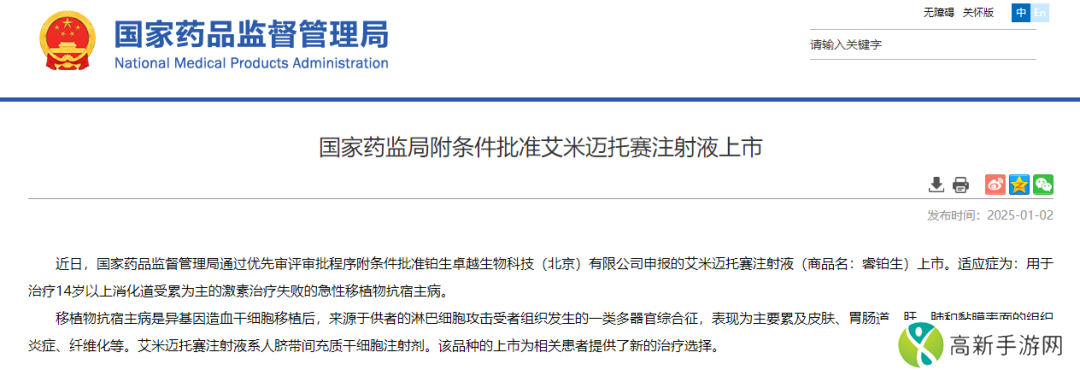 本站 1 月 2 日消息,据央视新闻报道,今天(2 日),国家药监局通过优先审评审批程序附条件批准我国首款干细胞治疗药品艾米迈托赛注射液上市。这是一种罕见病用药,用于治疗 14 岁以上因血液系统疾病进