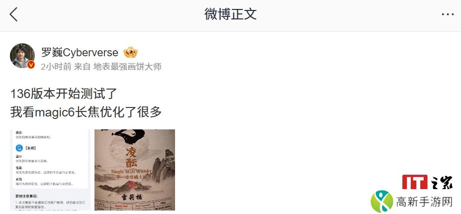 本站 1 月 2 日消息,荣耀首席影像工程师罗巍今日发文透露,Magic6 系列手机“136”版本开始测试,并称“看 Magic6 长焦优化了很多。”据本站此前报道,荣耀 Magic6 系列手机已于去
