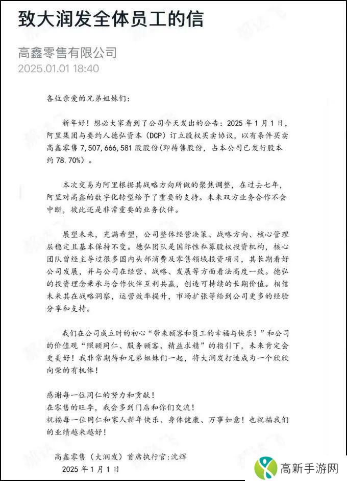本站 1 月 2 日消息,阿里巴巴昨日发布公告称,子公司及 NewRetail 与德弘资本达成交易,以最高约 131 38 亿港元出售所持高鑫零售(大润发母公司)全部股权,合计占高鑫零售已发行股份的