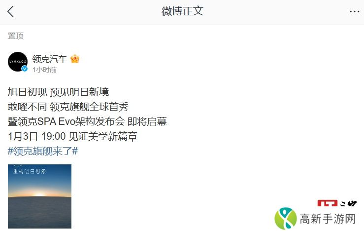 本站 1 月 1 日消息,领克汽车官方今日发文宣布,领克旗舰全球首秀暨领克 SPA Evo 架构发布会定档 1 月 3 日 19:00 举行。领克汽车销售有限公司副总经理穆军在去年 12 月发文称,领