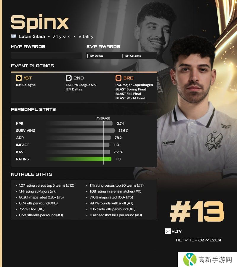 Spinx连续第三次登上HLTV 年度TOP20选手榜单,这是因为他在整个赛季都表现出非凡的稳定性。过往简介:Spinx是最早的以色列“黄金一代”选手之一,和他的大多数同龄人一样,他的第一步也是在当地
