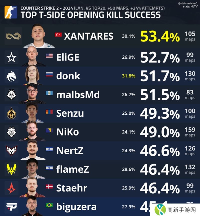 排在第一的XANTARES属于是又狂又准的类型。日前有CSer整理了2024年线下赛对阵Top20战队、地图样本量在50张以上、首杀尝试率在24%以上时,进攻方的空间夺取者首杀成功率的前十名榜单。排在