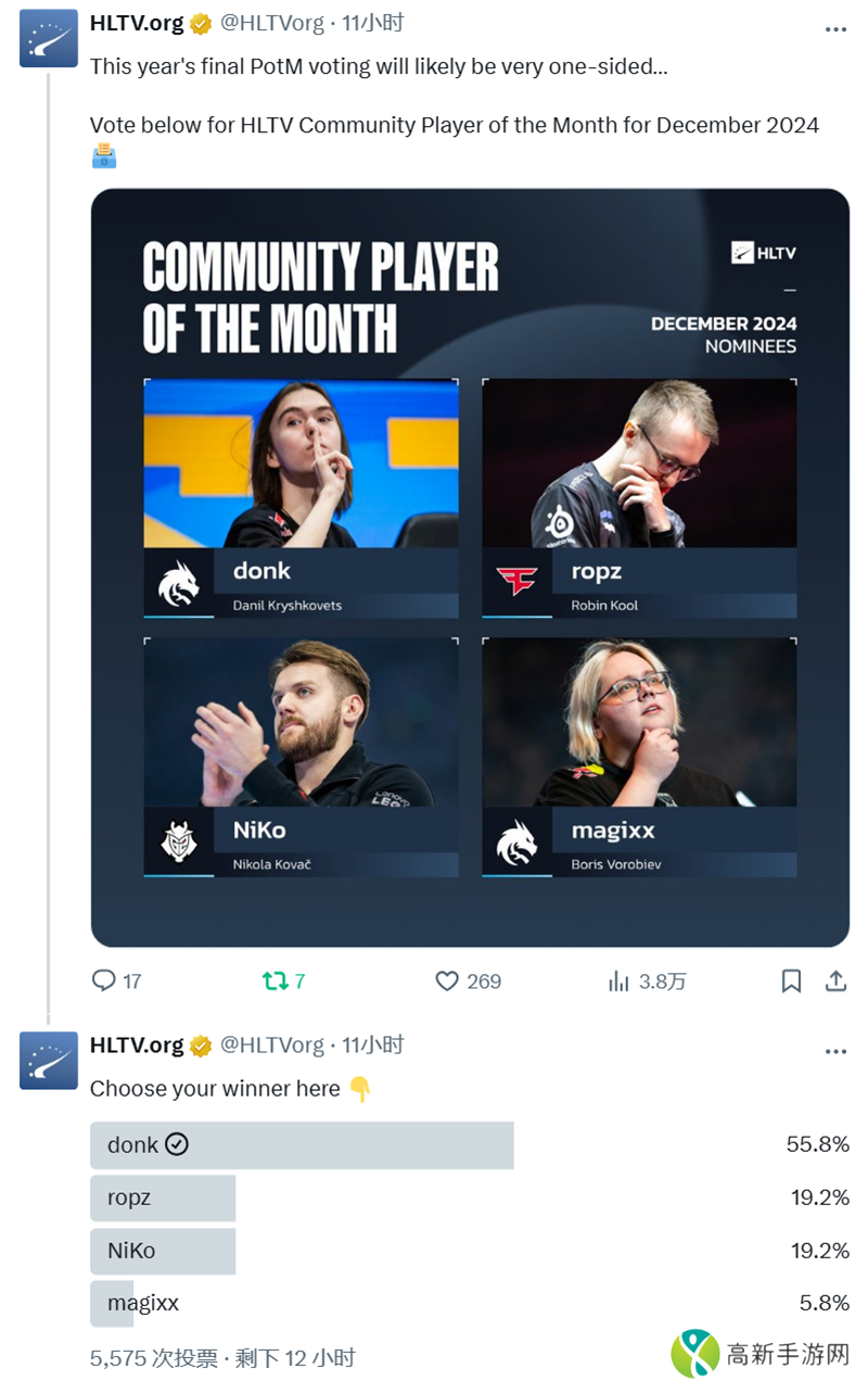 你觉得谁能够成为最终的12月代表选手呢?日前HLTV在社交平台上发起投票,在四位提名选手中经过社区投票选出12月的代表选手。四位提名选手分别是donk、ropz、NiKo和magixx,他们都在上海M