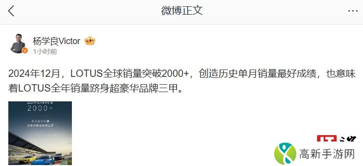 本站 1 月 1 日消息,浙江吉利控股集团高级副总裁杨学良今日发文分享,2024 年 12 月,LOTUS 莲花跑车全球销量突破 2000+,创造历史单月销量最好成绩,也意味着 LOTUS 全年销量跻