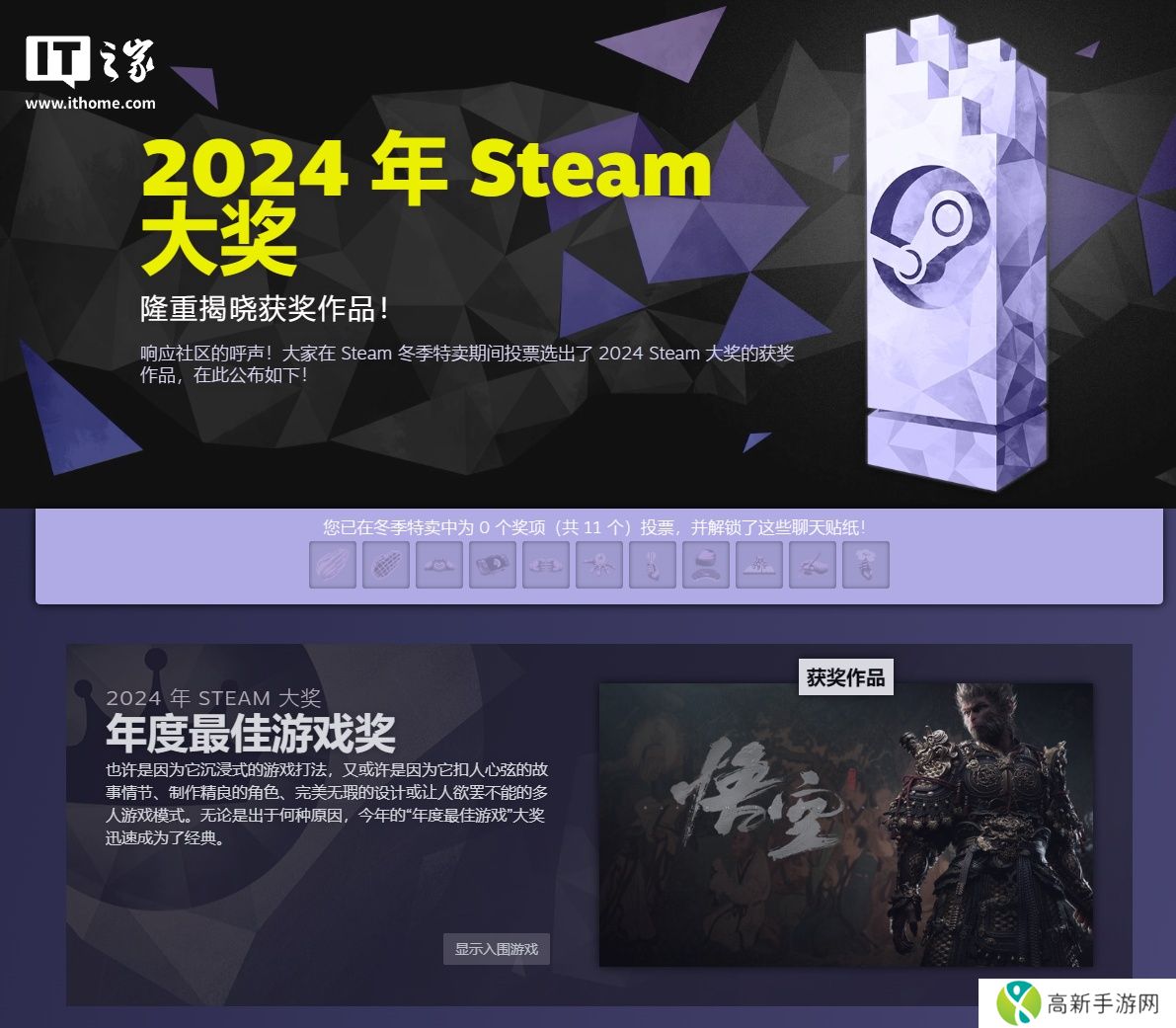 本站 1 月 1 日消息,Steam 平台今日公布年度游戏大奖评选结果,《黑神话:悟空》最终斩获“年度最佳游戏奖”,并同时拿下“纵使手残仍大爱奖”和“杰出剧情游戏奖”。本站注意到,游戏科学创始人