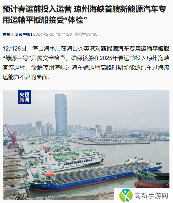本站 12 月 28 日消息,据央视新闻报道,今日,海口海事局在海口秀英港对新能源汽车专用运输平板驳“绿源一号”开展安全检查,确保该船在 2025 年春运前投入琼州海峡客滚运输,缓解琼州海峡过海车辆运
