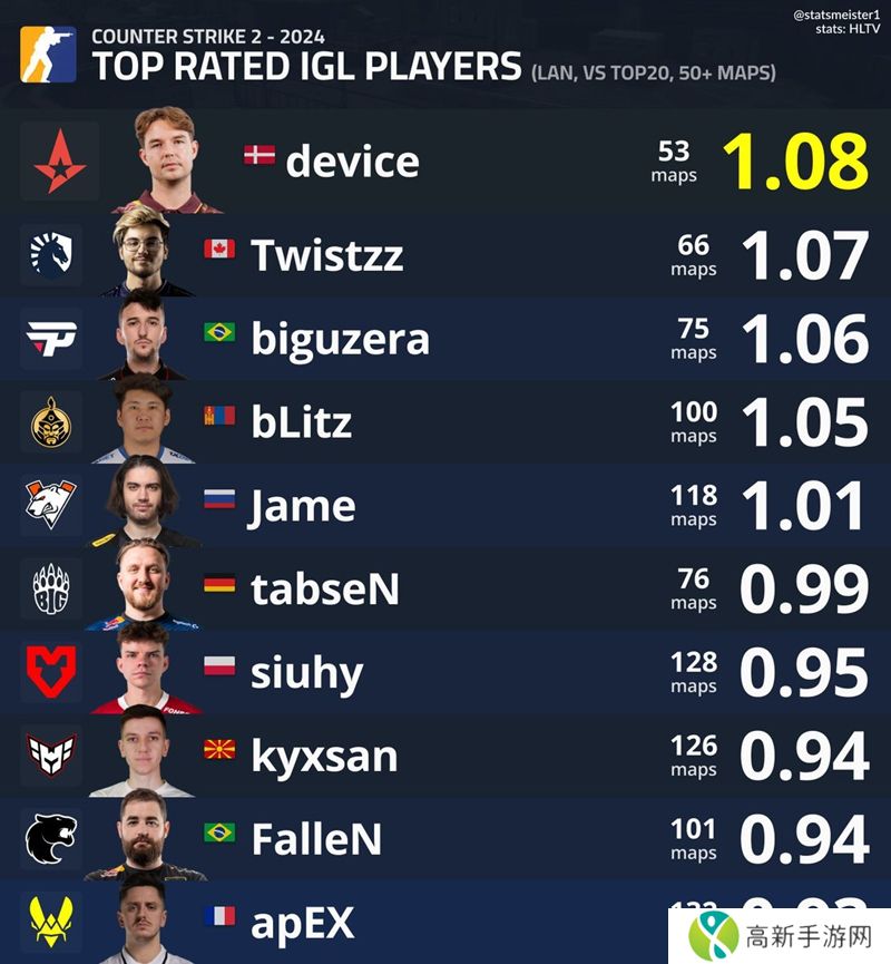 一起看看今年的指挥rating排行榜吧。日前有CSer整理了2024年线下赛对阵Top20战队,地图数在50张以上时的指挥rating前十榜单。device和Twistzz两人在转型指挥之后还有着不俗