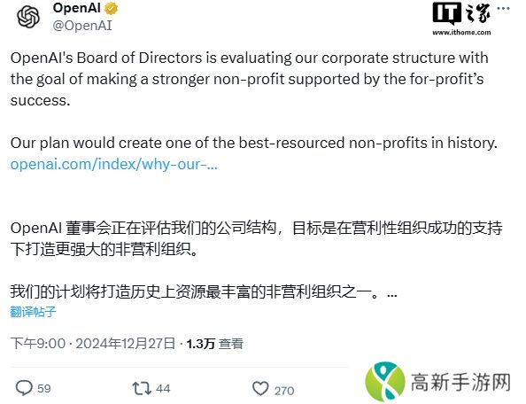 本站 12 月 27 日消息,OpenAI 刚刚发布了一篇关于其公司结构调整的博文,旨在“更好地支持其确保 AGI(通用人工智能)造福人类的使命”,主要包括三个目标,本站总结如下:选择最有利于实现长期