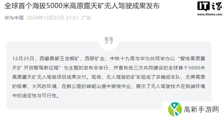 感谢本站网友 Autumn_Dream 的线索投递! 本站 12 月 25 日消息,华为官方今晚发文,宣布该公司今日与西部矿业、中铁十九局在西藏昌都玉龙铜