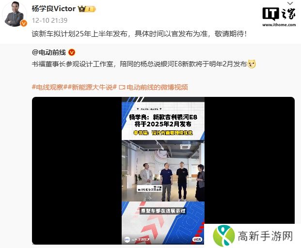 本站 12 月 12 日消息,吉利控股集团高级副总裁@杨学良Victor 透露,新款吉利银河 E8 拟计划明年上半年发布,具体时间以官方发布为准。本站注意到,吉利银河 E8 于今年 6 月在工信部新申