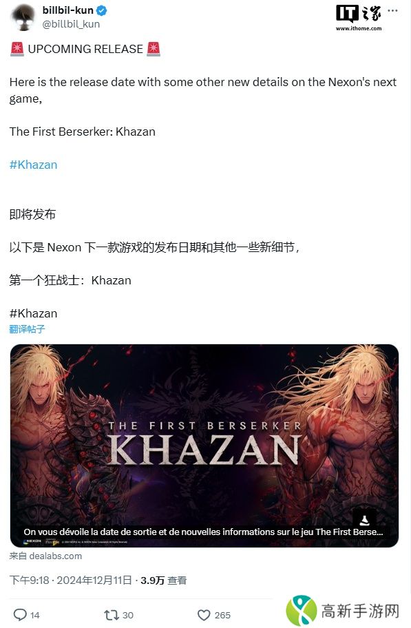 本站 12 月 12 日消息,爆料人 @billbil-kun 称,Nexon《地下城与勇士》IP 衍生的硬核 ARPG 游戏新作《第一狂战士:卡赞》将于 2025 年 3 月 27 日发售。他表示,