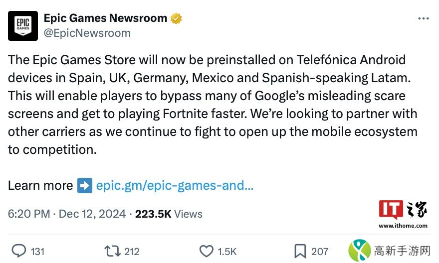 本站 12 月 13 日消息,Epic Games 宣布将与欧洲 拉丁美洲电信运营商 Telefónica 展开合作,将其 Epic 游戏商店预装到 Telefónica 提供的所有合约安卓手机上