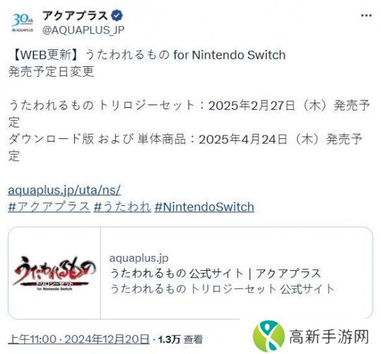 12月20日,发行商AQUAPLUS宣布《传颂之物》三部曲Switch版(日服)将延期发售,这包含了《传颂之物》系列的三部作品:《传颂之物:给逝者的摇篮曲》、《传颂之物:虚伪的假面》、《传颂之物:二人