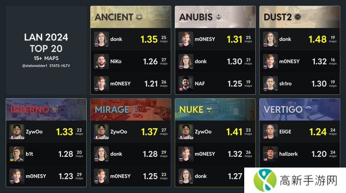上海Major的落幕标志着今年所有大型赛事已经全部结束,有国外的数据爱好者制作了今年在各张地图上表现最好的选手,以下是详细信息:1 Ancient:donk-1 35NiKo-1 26m0NESY-1
