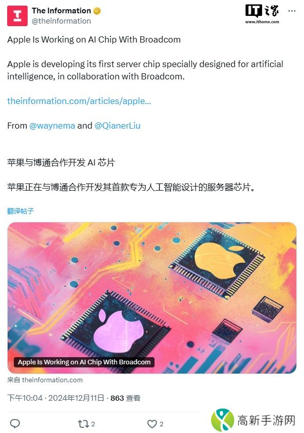 感谢本站网友 HH_KK 的线索投递! 本站 12 月 11 日消息,The Information 报道称,苹果正在与博通合作开发其首款专为人工智能设计