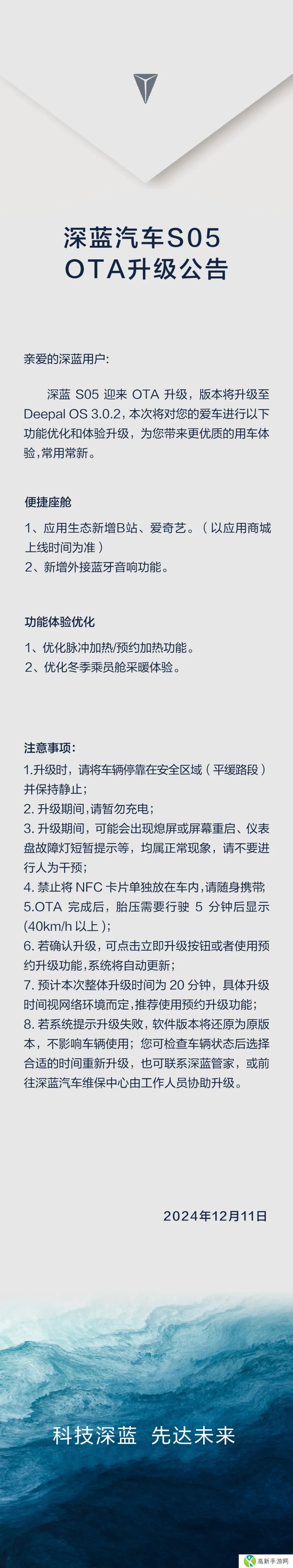 感谢本站网友 华南吴彦祖 的线索投递! 本站 12 月 11 日消息,深蓝汽车今日发布了深蓝 S05 的 OTA 公告,宣布推送最新的 Deepal OS