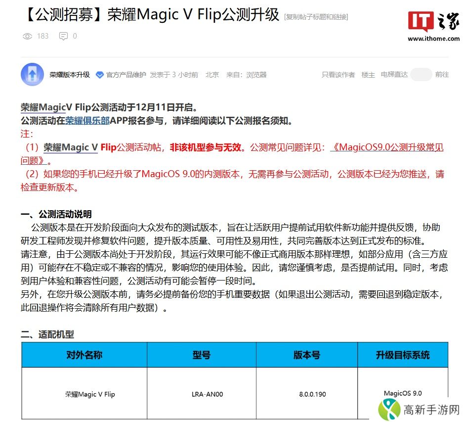 本站 12 月 11 日消息,荣耀官方今日发布公告,Magic V Flip 小折叠屏手机现开启MagicOS 9 系统公测升级(目标版本为 MagicOS 9 0 0 118),用户升级公测版本前,