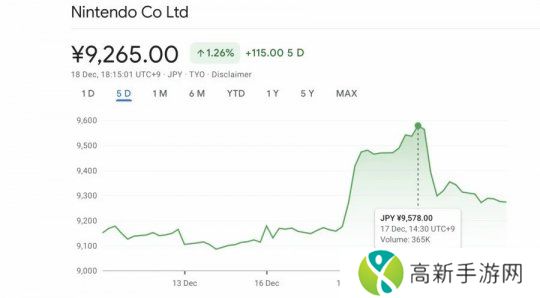 随着人们对Switch 2的期待日益增加,任天堂的股价在2024年12月17日创下了9578日元的历史新高,收盘价为9490日元。根据日经亚洲的报道,这一增长有两个原因,第一个原因,或许也是最明显的原