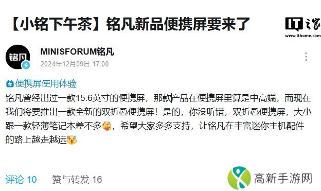 本站 12 月 11 日消息,铭凡曾经推出过一款 15 6 英寸的便携屏,然后本周一又宣布将推出一款新的“双折叠便携屏”。截至本站发稿,目前铭凡还没有公布关于这款新品的详细信息,仅透露“大小跟一款轻薄