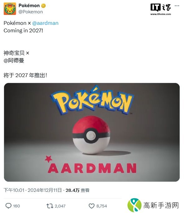 本站 12 月 11 日消息,宝可梦公司宣布与阿德曼动画公司达成协议,将联手开展“一个特别项目”,具体合作内容暂未公布,只表示计划于 2027 年的某个时候推出。本站注:英国阿德曼动画公司 (Aard