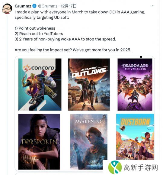 近日知名反Woke推主Grummz(真名Mark Kern)在X上发帖,晒出自己今年的“成绩单”。他说今年3月才计划干掉3A游戏中的DEI,尤其是针对育碧。显然他已经收获颇丰,