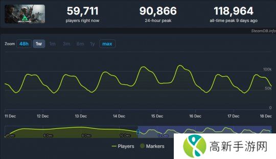 12月5日《三角洲行动》(Delta Force)在Steam和EPIC等平台开启全球公测。现在据SteamDB数据显示,《三角洲行动》Steam同时在线人数峰值达到118964人,表现相当不错。《三