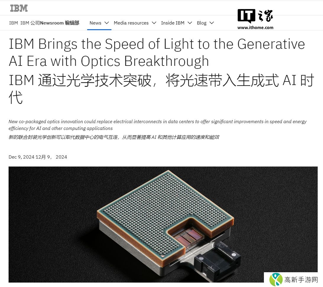 本站 12 月 11 日消息,IBM 宣布开发出一种新的光学技术,能够以光速训练 AI 模型,同时大幅节省能源。该公司表示,通过将这项突破应用于数据中心,训练一个 AI 模型所节省的能源相当于 500
