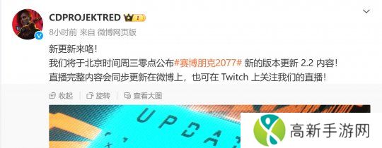 CDPR官博宣布,《赛博朋克2077》新版本2 2将在北京时间周三零点公布,直播完整内容将会同步更新在微博上。CDPR表示将为《赛博朋克2077》添加一些“酷的东西”。此前官方