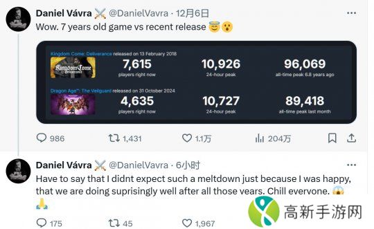 昨天,《天国:拯救》的主创Daniel Vavra发推,略带嘲讽了BioWare最近发售的大作《龙腾世纪:影障守护者》。他发帖对比了两个游戏的在线数据,暗示《龙腾世纪:影障守护者》的在线人数甚至不如7