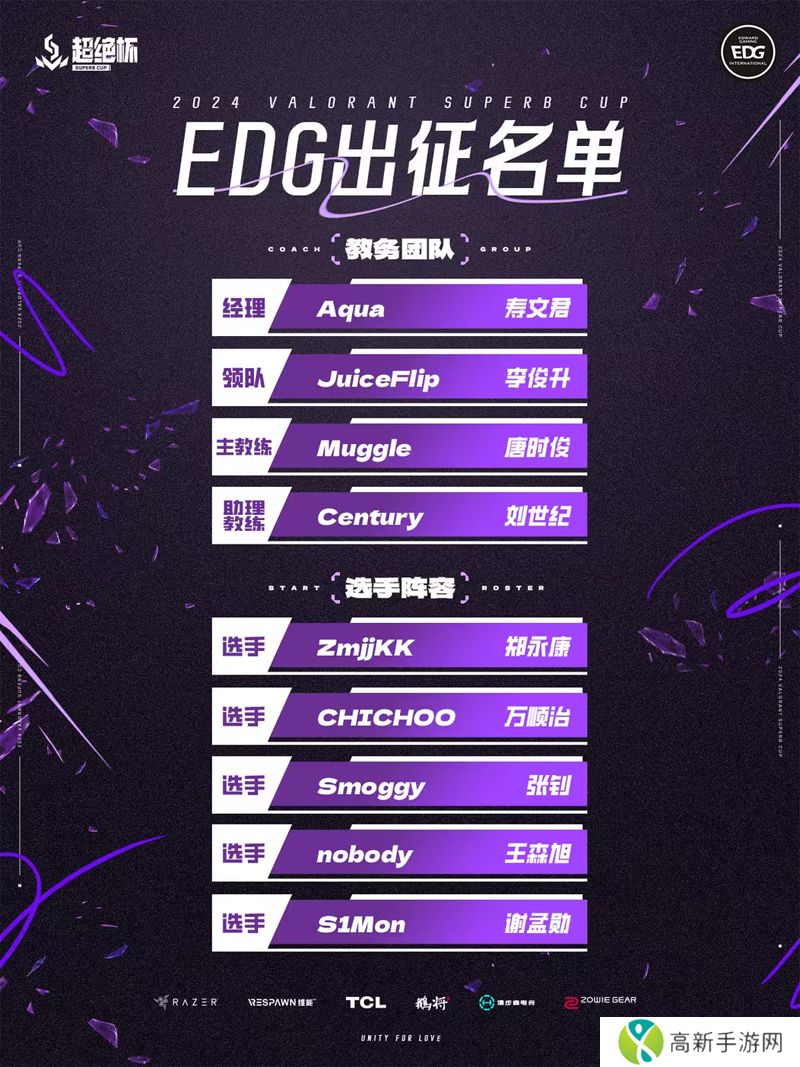 昨晚,EDG官方公布了SUPERB超绝杯职业赛的参赛大名单。教务团队:经理 Aqua(寿文君)、领队 JuiceFlip(李俊升)、主教练 Muggle(唐时俊)、助理教练 Century(刘世纪)选