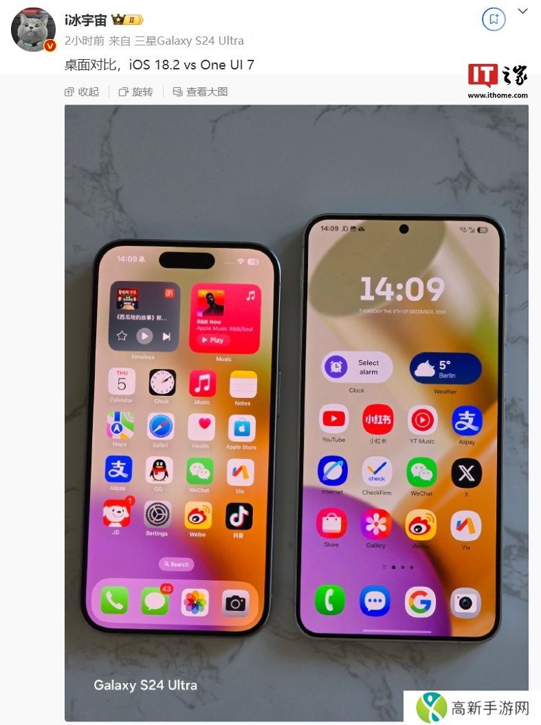 本站 12 月 5 日消息,博主 @i冰宇宙 今日(12 月 5 日)发布微博,分享了三星 One UI 7 0 系统动画效果,并与 iPhone 的桌面进行对比。博主还在一段 53 秒的视频中将搭载