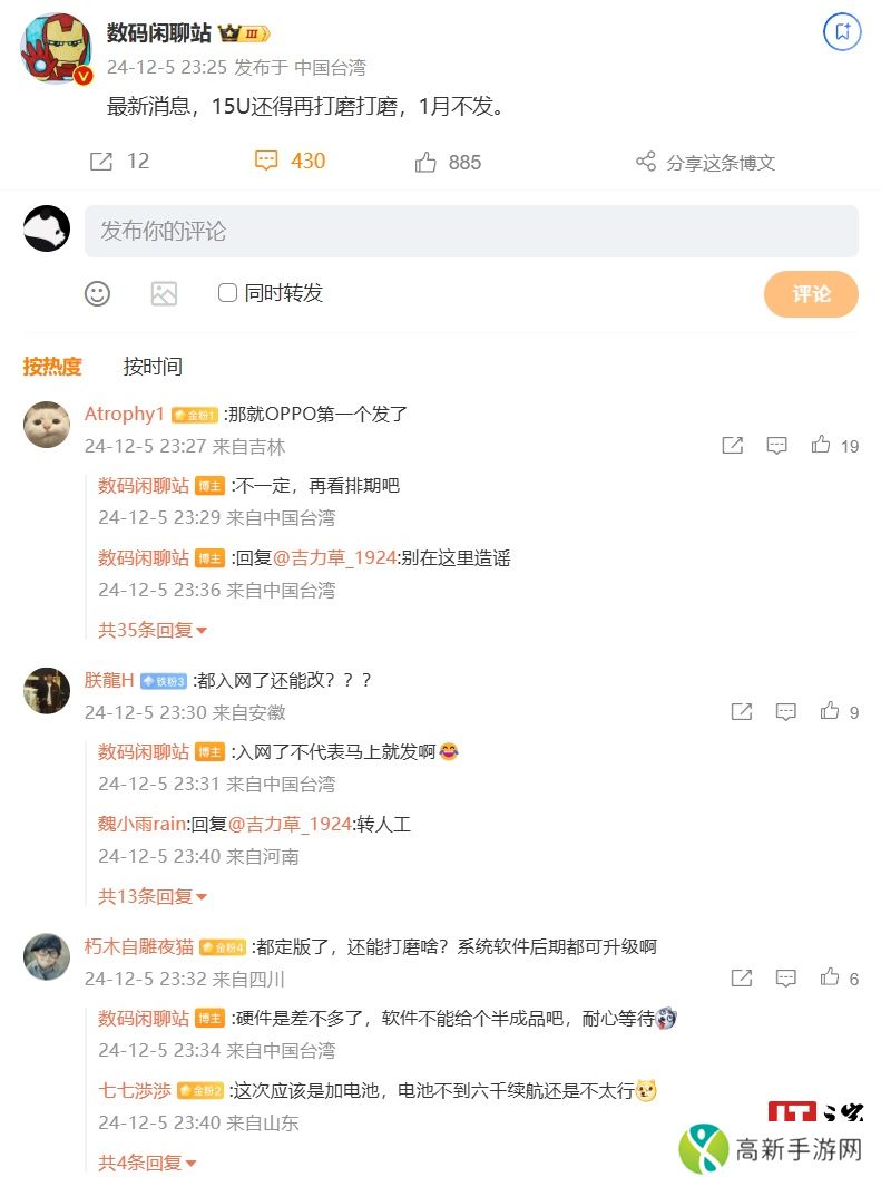 本站 12 月 5 日消息,博主@数码闲聊站 今日发文透露,某厂“15U”手机还得再打磨,1 月不发(此处预计指明年 1 月)。结合过往爆料及评论区讨论来看,预计为小米 15 Ultra。博主在评论区