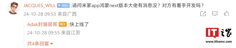 本站 12 月 6 日消息,今年 10 月,有爆料称小米米家 App 鸿蒙 HarmonyOS NEXT 版“快上线了”。本站今日询问小米客服获悉,华为手机的鸿蒙(HarmonyOS NEXT)系统,