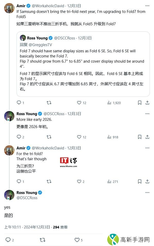 本站 12 月 5 日消息,屏幕供应链咨询公司 DSCC 首席执行官罗斯・杨(Ross Young)昨日(12 月 4 日)在 X 平台发布推文,表示三星的三折叠手机发布,要等到 2026 年年初了。