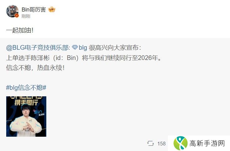 直播吧12月5日讯 今日BLG官方官宣与Bin选手续约,Bin转发续约公告,并配文:一起加油!