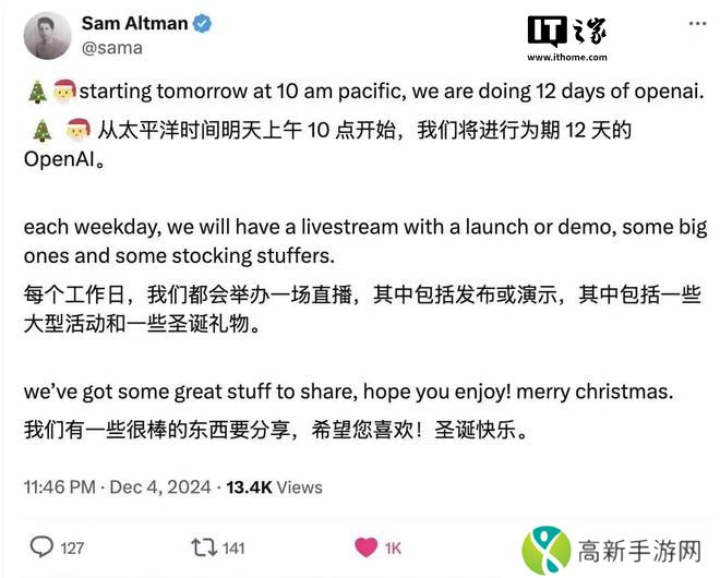 感谢本站网友 小小绫波丽 的线索投递! 本站 12 月 5 日消息,当地时间 12 月 4 日,OpenAI CEO阿尔特曼在社交媒体透露,接下来每个工作