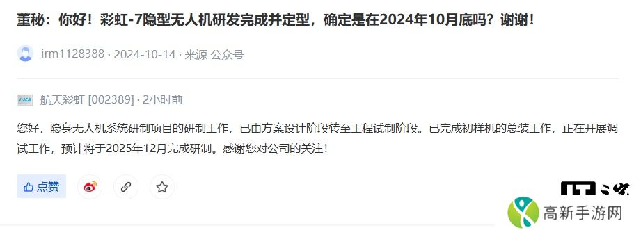 本站 12 月 4 日消息,航天彩虹无人机股份有限公司(本站简称“航天彩虹”)是中国航天科技集团公司第十一研究院控股的上市公司,主要从事彩虹系列无人机以及新材料产品的设计研发和生产。航天彩虹今日在回复