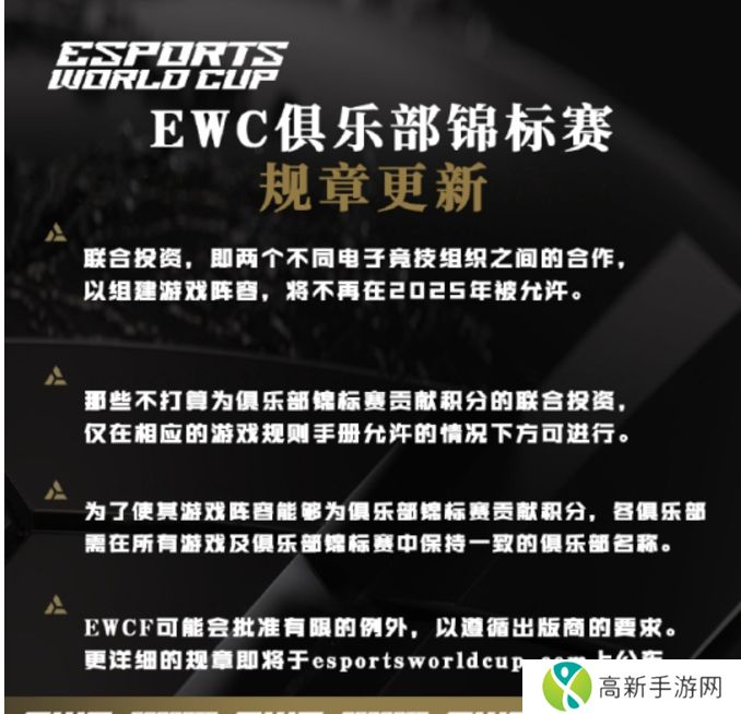 EWC电竞世界杯(DOTA2利雅得大师赛为旗下项目之一)刚刚发布了规章更新,具体如下:今年电竞世界杯期间有不少俱乐部相互合作组建战队以谋求更高的俱乐部积分,在明年这将不复存在。